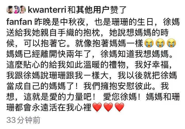 10月7日,范玮琪在社交平台上晒出了与S妈的合照,并深情写道:“昨晚是中秋夜,也是珊珊的生日。徐妈送给我她亲自手织的抱枕,她说想妈妈的时候,可以抱着它,就像抱着妈妈一样。妈妈已经离开快两年了,徐妈知道我想妈妈,这么贴心地给我如此温暖的礼物,我好幸福。我跟徐妈说珊珊跟我一样大,我以后就把徐妈当成自己的妈妈了!我们拥抱安慰彼此。我想,这就是爱的力量吧!爱您徐妈!妈妈和珊珊都会永远活在我心里。”