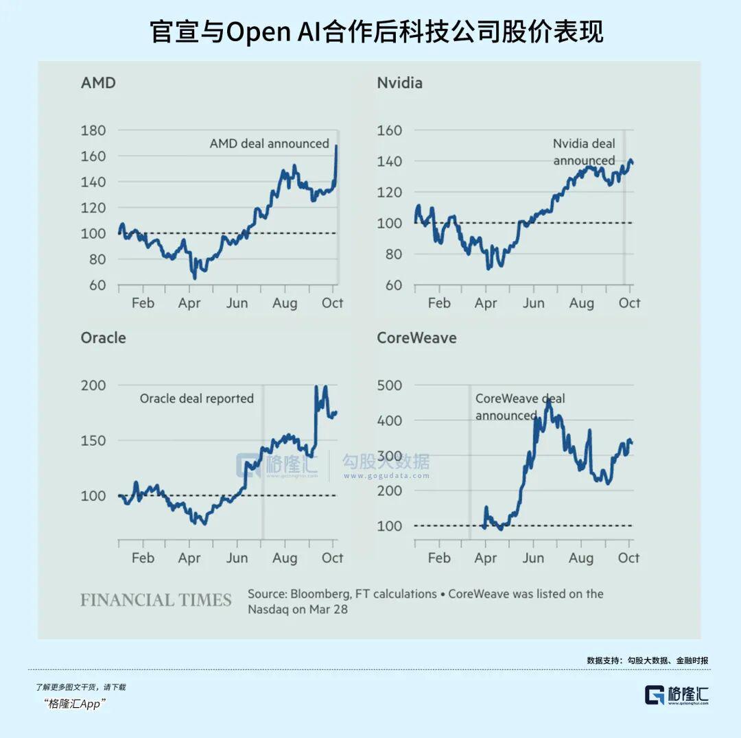 推动股指上涨的另一关键动力来自人工智能,更直接地说,是OpenAI接连推动多项关键合作,为合作商带来了难以想象的业绩增量,半导体相关股票在假期里延续上涨势头。存储芯片巨头三星、SK海力士的暴涨带动了韩国股市。起因是三星和海力士突然宣布与OpenAI达成合作,为后者的星际之门项目提供芯片,直接引爆了存储芯片赛道。接着,OpenAI又与AMD达成合作,AMD未来要给OpenAI提供数十万块人工智能芯片。这也说明,OpenAI在资本市场的确有点石成金的地位,过去与Nvidia、Oracle和CoreWeave达成过类似协议,而这些供应商未来的业绩增量又高度依赖于OpenAI的盈利能力,或者说融资能力,因为目前这些承诺都是远超过其收入的。