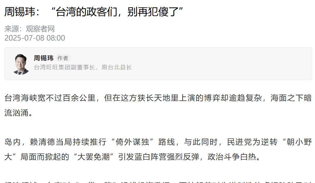 他一针见血地指出:“他们的真正恐惧在于,一旦两岸开放互动,谎言便会不攻自破,执政合法性也将随之崩塌。”他还预判,所谓“倚美谋独”“牺牲民生换取政治私利”的路线终难持久,“水能载舟亦能覆舟”,下次选举未必还能继续掌权。