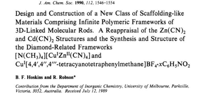 [7]Robson, R. (2024). The historical development of the concepts underlying the design and construction of targeted coordination polymers/MOFs: a personal account. The Chemical Record, 24(5), e202400038.