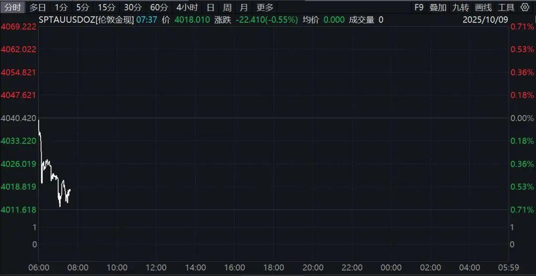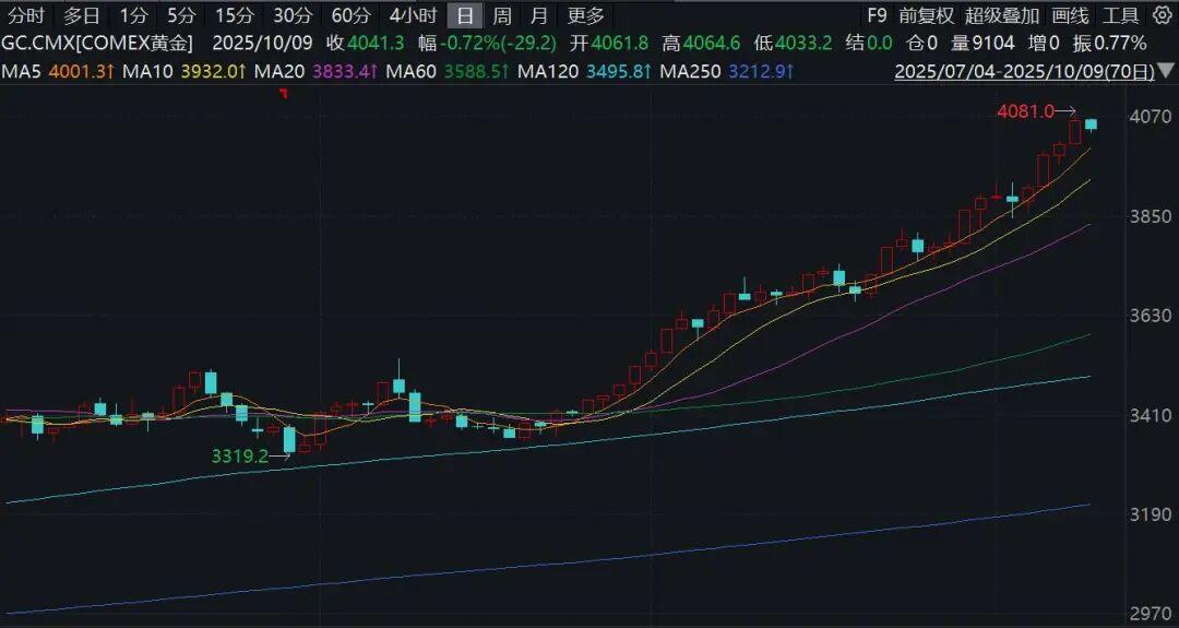 10月8日,国际金价上演过山车行情。现货黄金一度触及4050美元/盎司历史高位,COMEX黄金期货收涨1.4%至4060.6美元/盎司,COMEX白银期货涨1.95%至48.44美元/盎司,现货钯金更是暴涨10%创2023年5月以来新高。然而,10月9日亚洲早盘,COMEX黄金期货突然跳水,跌幅超0.7%。