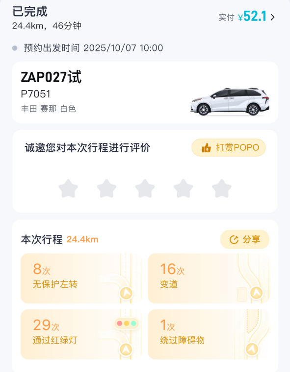 上午10点38分,车辆抵达目的地。行程单显示:全程24公里,费用52.1元。详细数据显示,车辆完成了8次无保护左转、16次变道,通过29个红绿灯,并成功避让1次障碍物。