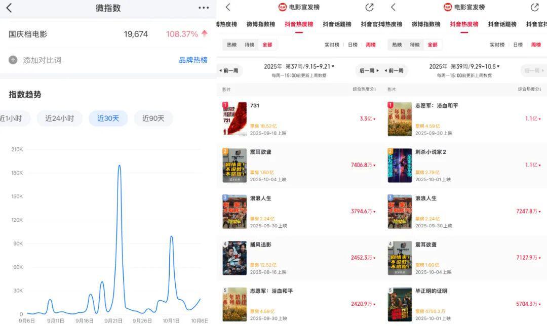 猫眼专业版APP显示,国庆档电影的抖音热度榜,《志愿军:浴血和平》《刺杀小说家2》的热度分在上映前夕达到1亿的峰值,看似不低。可是对比来看,《731》在映前的热度分已经高达3.3亿!