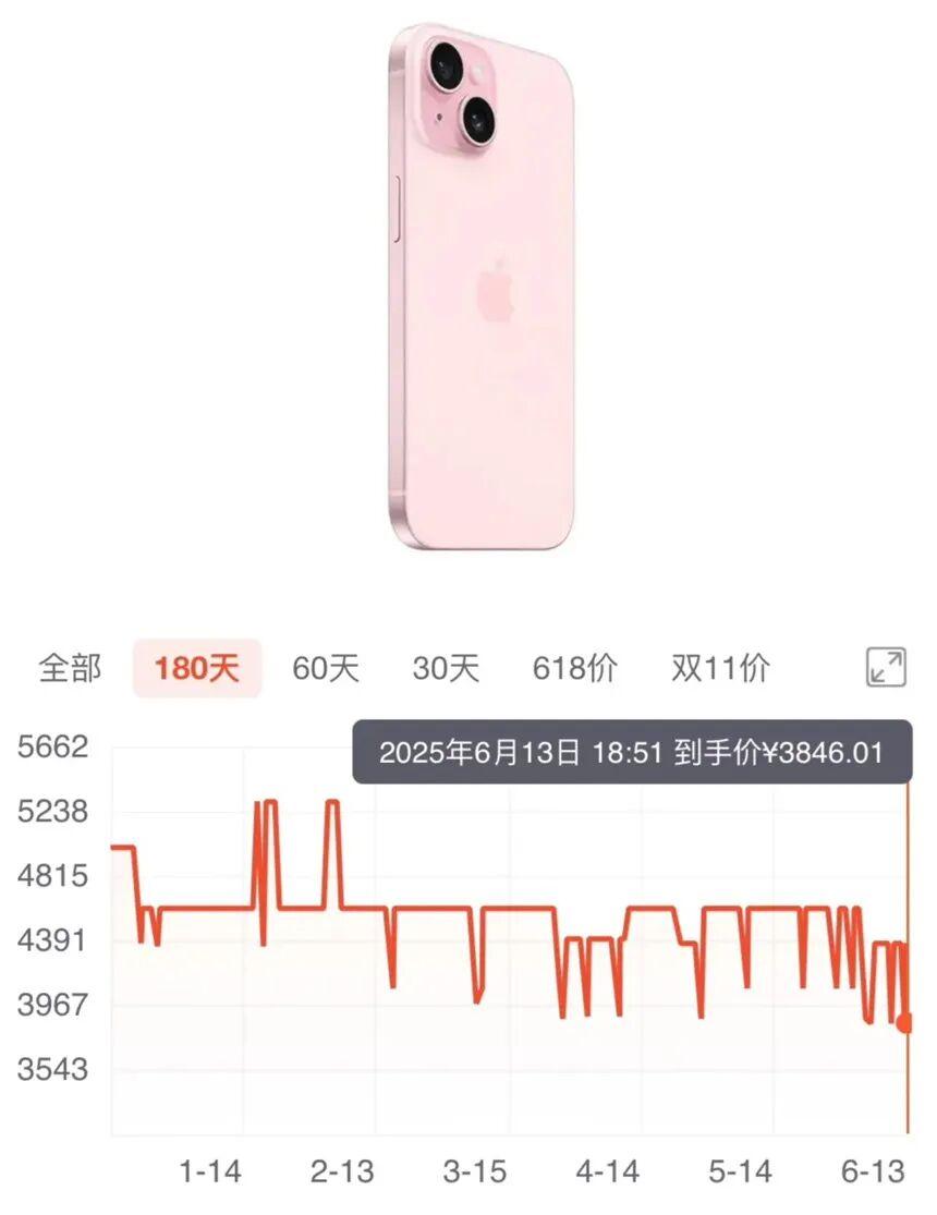 回顾价格历程,去年9月iPhone 16系列发布后,iPhone 15就降到了5399元,这个价格一直持续到今年9月被下架。在今年618的时候,128GB版本在JD叠加PLUS券和国补后,最低价格来到3846元,已经算是历史新低了。