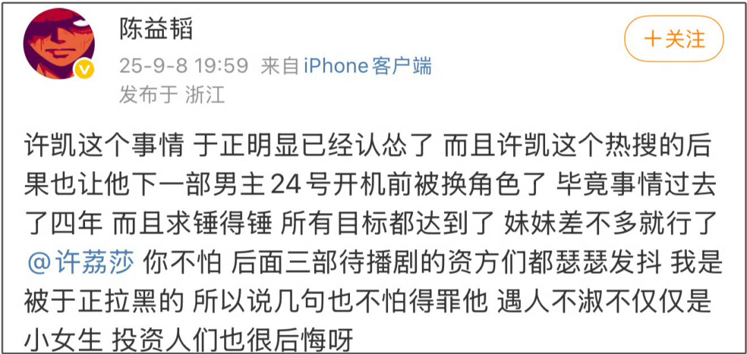 早前,制片人陈益韬曾率先下场爆料相关情况,透露称许凯原定主演的新剧《听风令》已被换角,并让爆料人许荔莎见好就收,不要再翻许凯旧账。而且,于正也似乎认怂了。但随即画风一转,陈益韬表示投资方和许荔莎一样遇人不淑都很后悔,还称三部待播剧的投资方都瑟瑟发抖。他出来发声则是因为已经被于正拉黑,不怕得罪他。究其目的,不是给许凯倒油,而是给投资方说话换取同情心,让许荔莎手下留情。之后,制片人又删除了相关言论,把水搅得更乱。