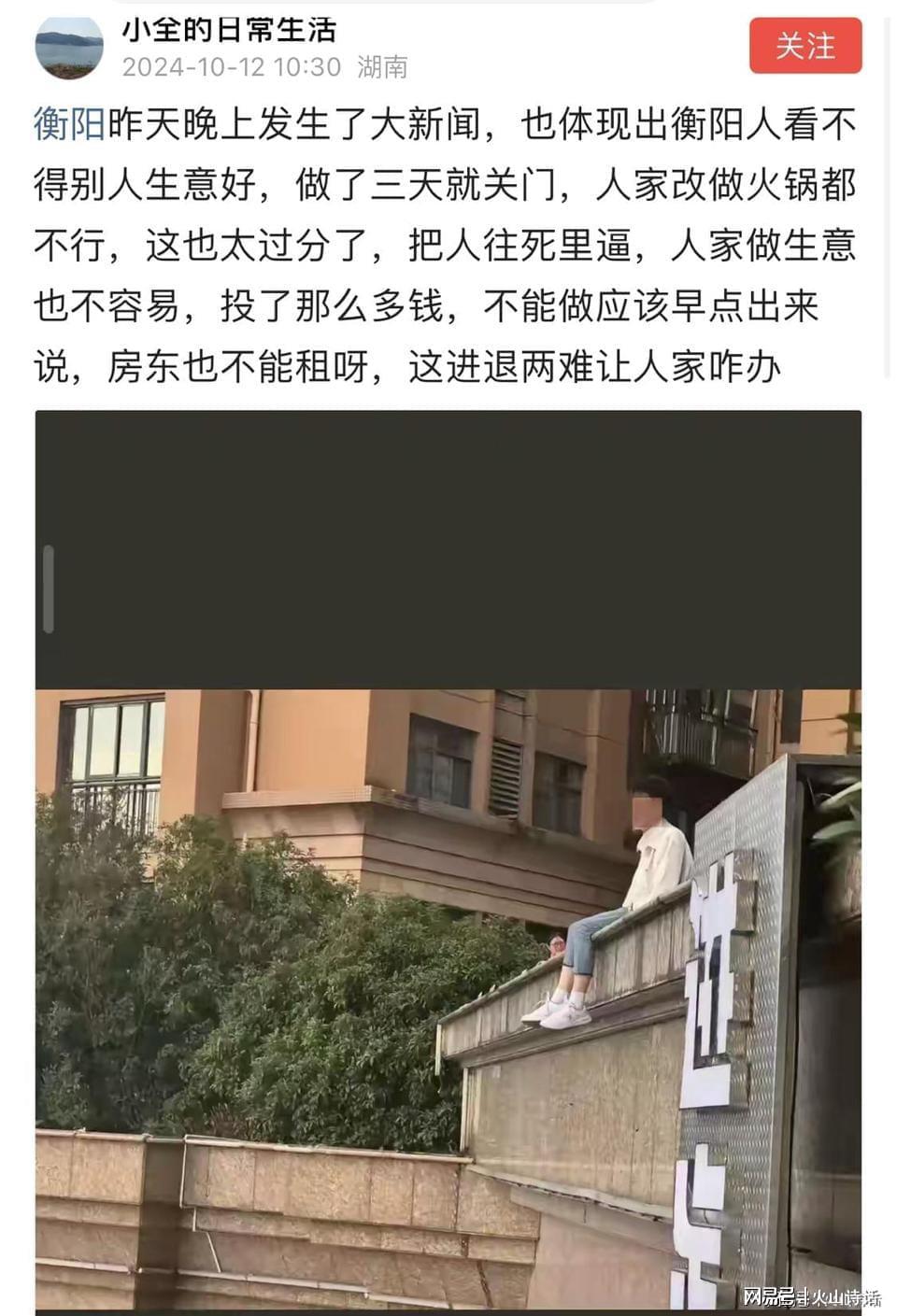 根据网传图片显示,一年轻男子坐在一小区楼顶的外墙上,心灰意懒,态度消沉。而门脸显示是,衡阳进步烧烤城。据了解,10月11日,这家烧烤店的总老板甚至坐在了湘江水岸新城某幢楼顶上,做出了要跳楼的闹剧。