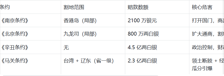 将《马关条约》与近代主要不平等条约对比,其“系统性摧毁”的特质一目了然: