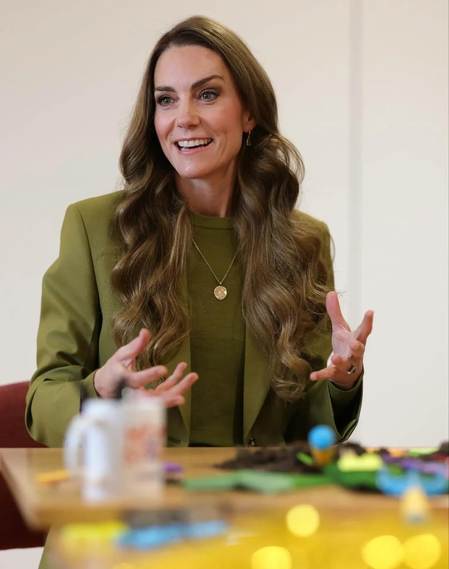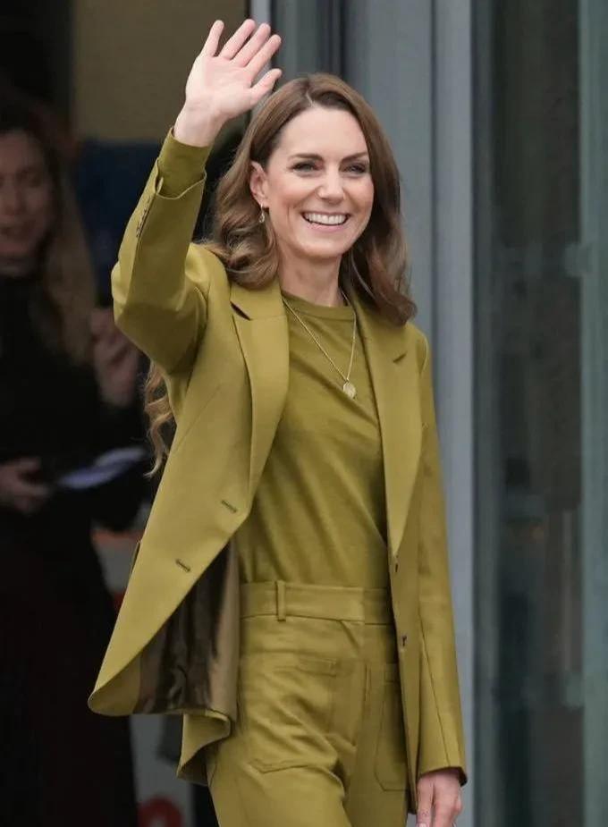 在穿搭方面,凯特王妃一如既往地展现出了她的简单大方。当天,她身穿橄榄绿套装(来自维多利亚·贝克汉姆品牌),搭配波浪卷发,优雅气质尽显。珠宝方面,她佩戴了Kiki McDonough的耳坠以及刻有三宝名字首字母的Daniella Draper项链,细节之处尽显品味。