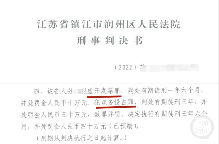 镇江市润州区人民法院判决书显示,孙某出生于1987年,曾是当地一家公司的财务经理。2021年9月3日,孙某因涉嫌职务侵占罪主动投案,同年10月1日被取保候审。2023年2月24日,孙某因犯虚开发票罪、职务侵占罪,被润州区人民法院判处有期徒刑三年六个月,并处罚金四十万元。2024年5月28日,镇江市中级人民法院作出维持原判的二审判决。同案人朱某也因虚开发票罪、单位行贿罪被判处有期徒刑8年。