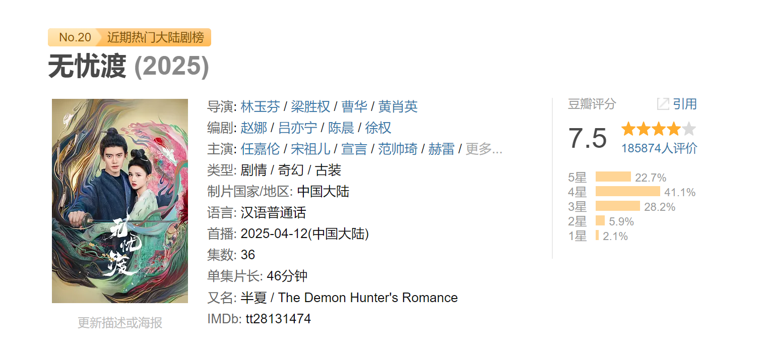 当然,《佳偶天成》之所以能取得如此漂亮的数据,并不仅仅依赖于客串演员的号召力。更重要的是,许多剧迷对任嘉伦的古装剧表现充满了期待。毕竟,他上半年主演的奇幻题材剧《无忧渡》在豆瓣上获得了7.5的高分,这在整体分值不高的古偶剧赛道中显得尤为突出。在任嘉伦的古装剧中,唯有代表作《锦衣之下》和令人意难平的《周生如故》能与之相媲美。