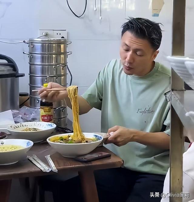 镜头里,他显得有些苍老和疲惫,眼袋清晰可见,应该是连日来的劳累所致。但他并没有在意这些,只是低头吹吹热气,用筷子把面拨到小碗里。