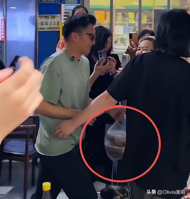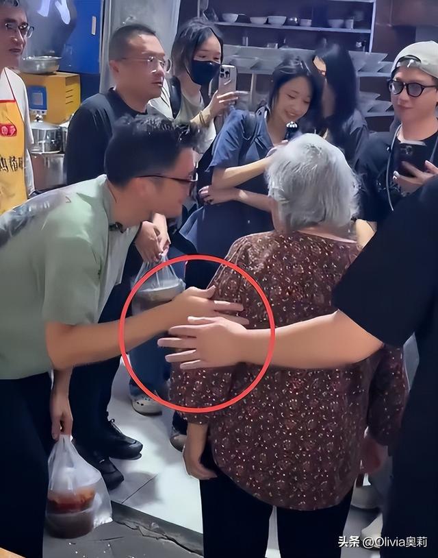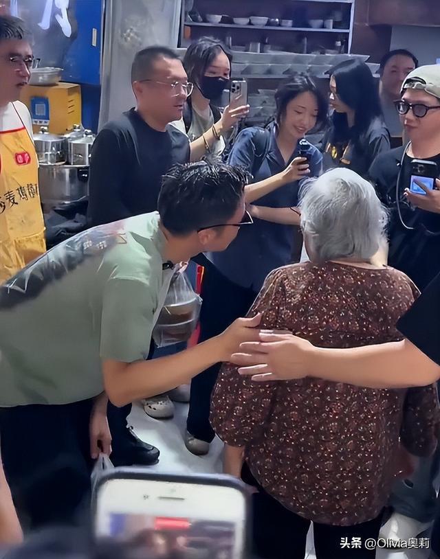 吃完面后,他在路边摊被粉丝围得水泄不通,却依然弯着腰扶一位老太太拍照。这一幕被许多网友拍了下来。
