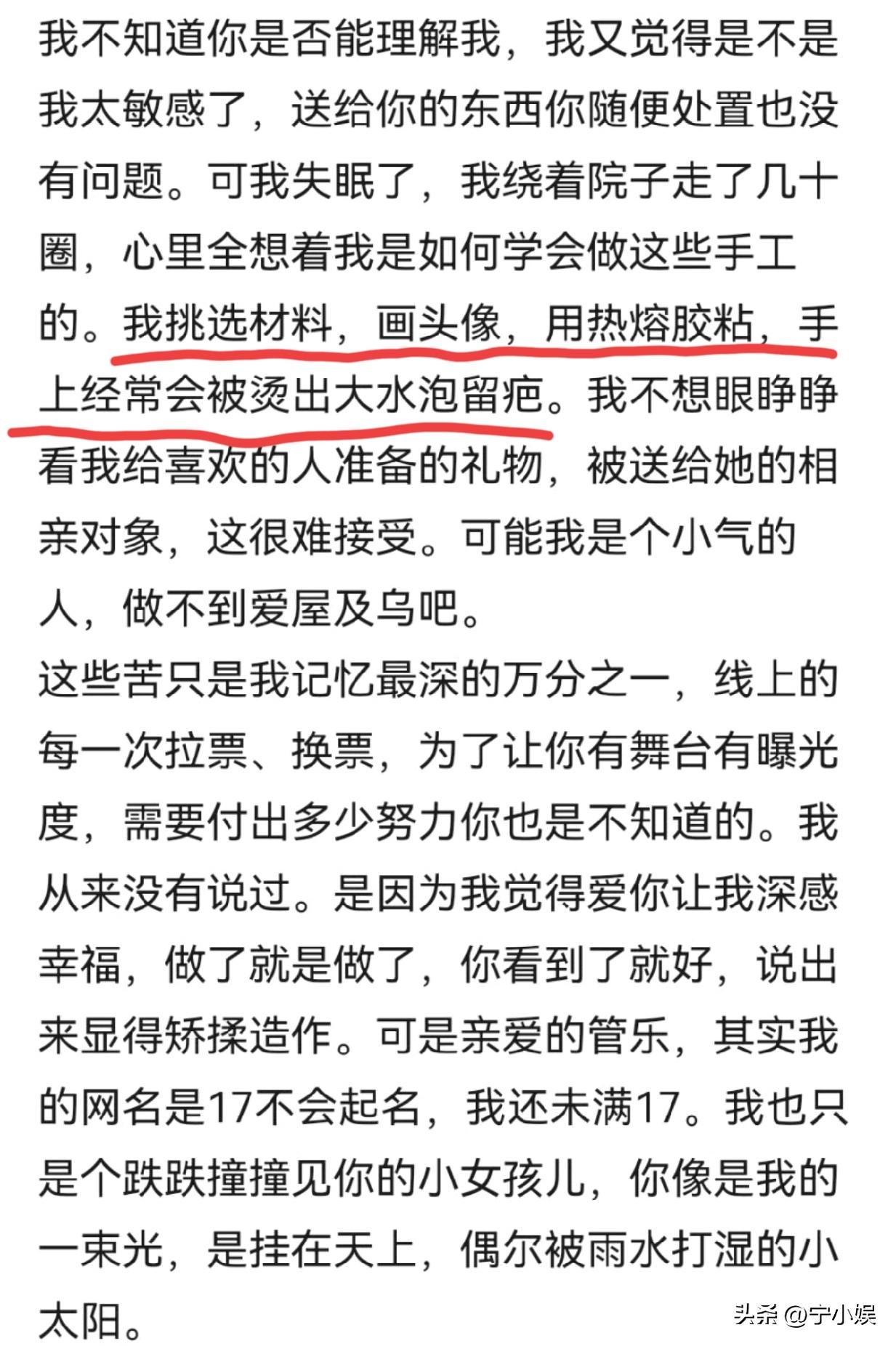 文字中,粉丝提到:这是自己第一次学着给别人做手工,并不是很熟练,但为了能让偶像喜欢让管乐开心,她学着挑选材料、画头像,用热熔胶粘,手上经常会被烫出大水泡……
