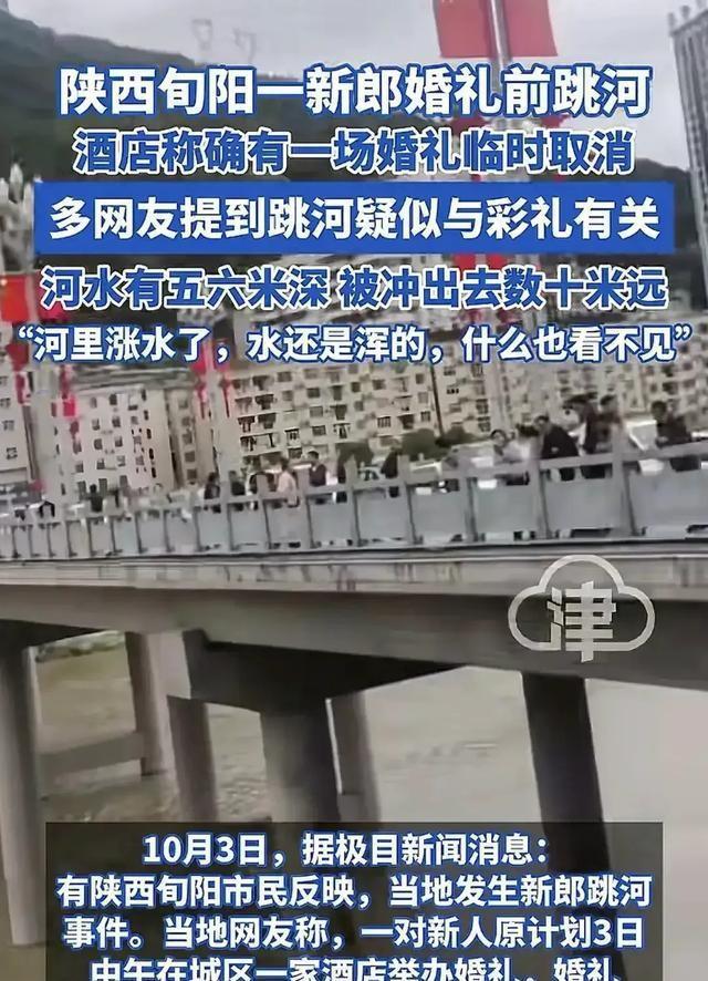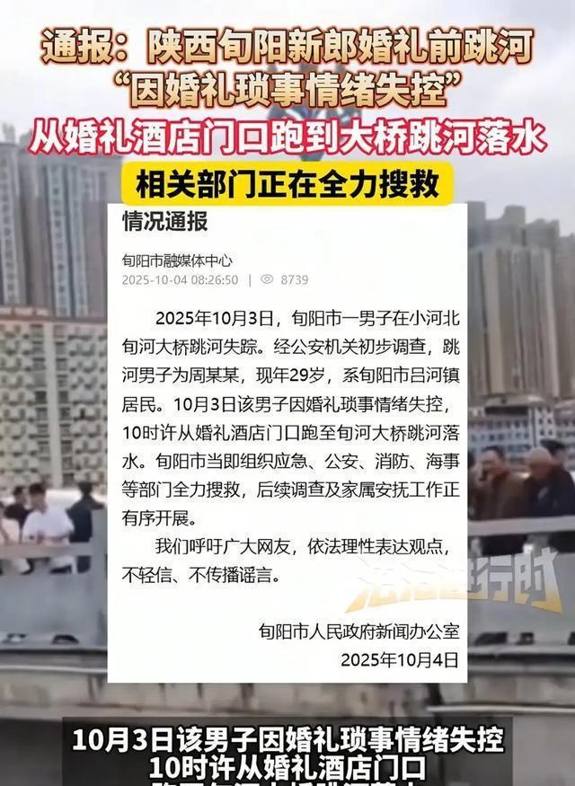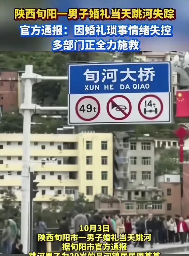 一个人,就这么从桥上跳下去了——10月3日,陕西旬阳旬河大桥上发生了一起令人震惊的悲剧:29岁的新郎周某在婚礼当天突然翻越护栏跳入河中。这场本应充满喜庆的婚礼,为何会以如此惨烈的方式收场?