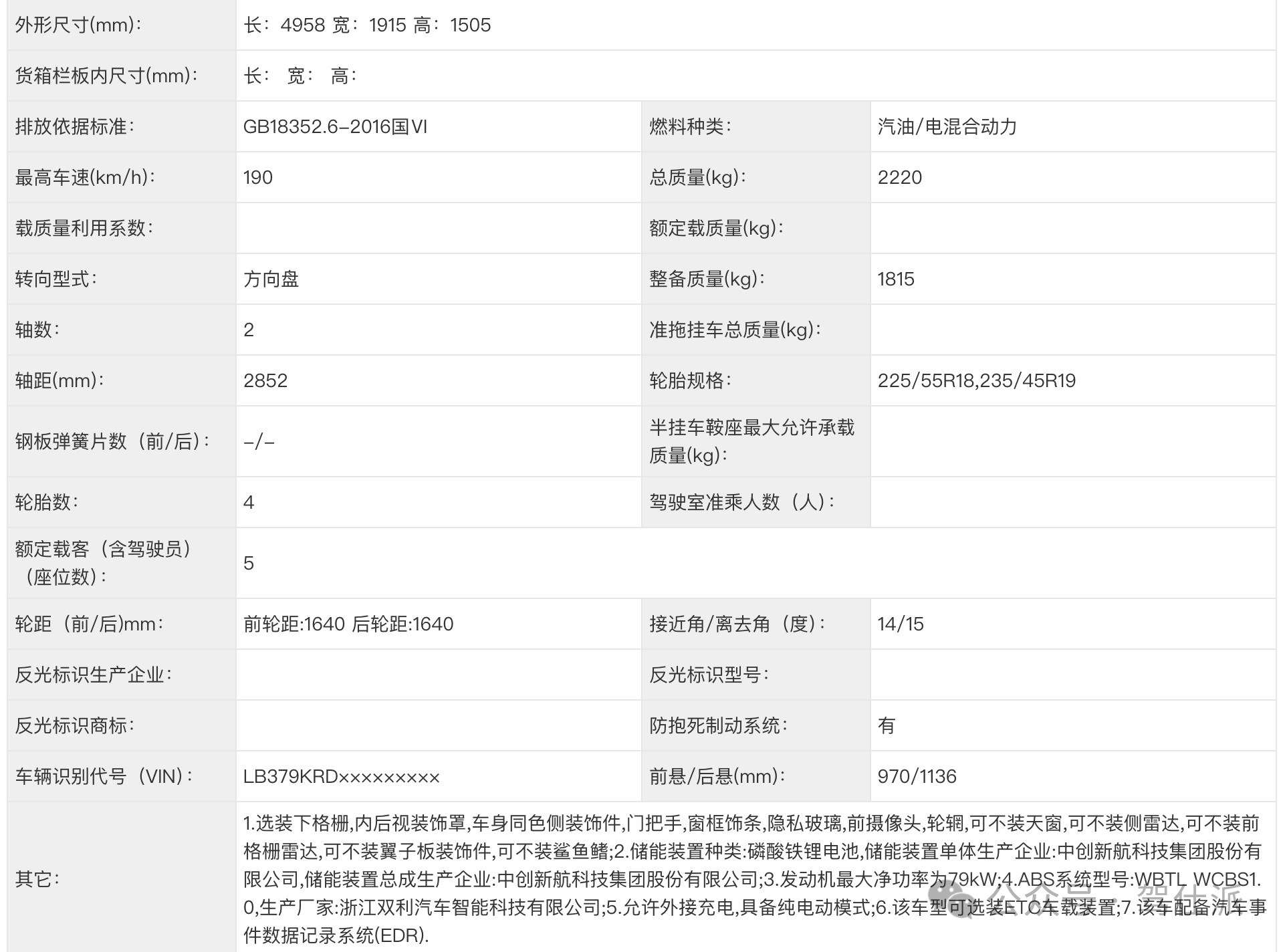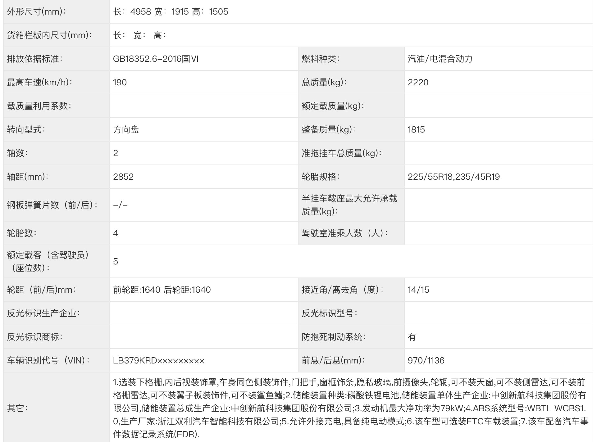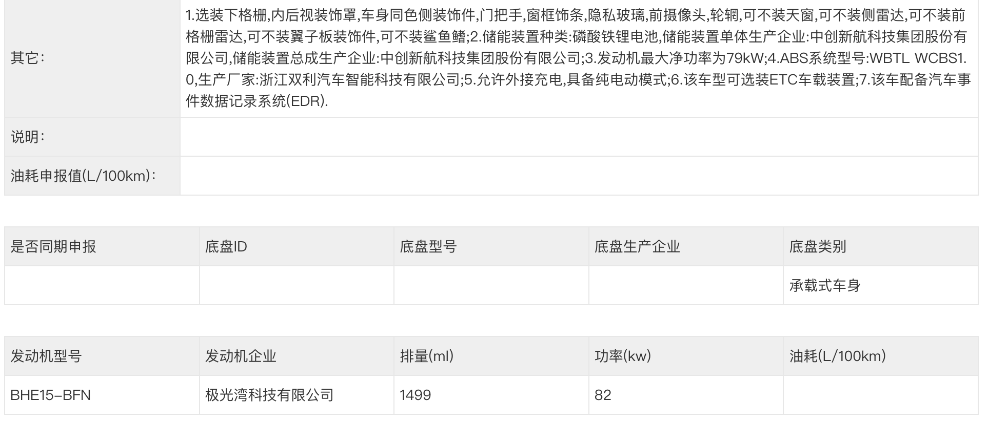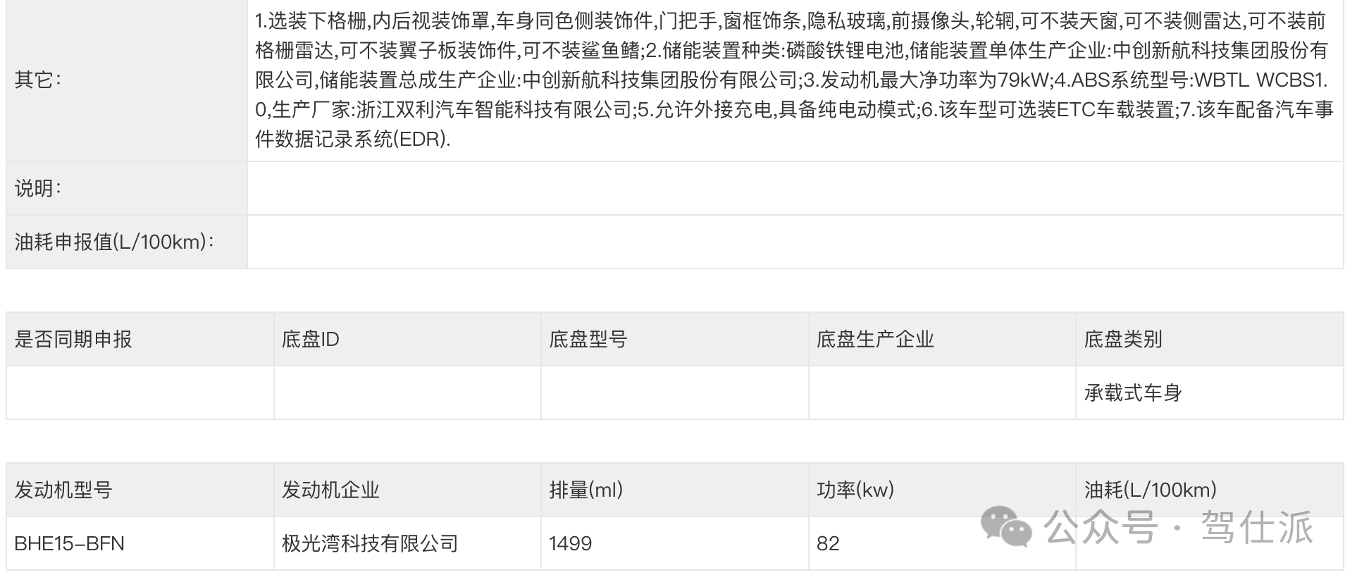 动力总成方面,星耀7搭载了吉利EM-i系统,采用1.5L自然吸气发动机配合单挡DHT变速箱。电池供应商方面,有江苏耀宁和中创新航两家可选。虽然吉利此次并未申报具体电池容量,但考虑到明年购置税减免新规定要求PHEV纯电续航里程要超过100公里,因此低配小电池版本可能将不会上市。
