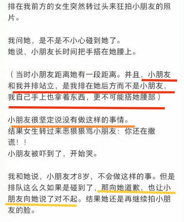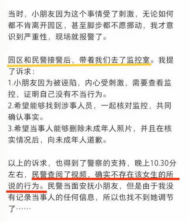 在北京环球影城的事件中,一名8岁男童在排队游玩‘飞跃侏罗纪’项目时,突然被前方女子转身怼脸狂拍,坚称男孩将手长时间放在自己腰部。男童被突如其来的指控吓哭,母亲询问后男童否认,但为了息事宁人,母亲还是向女子道歉,并要求孩子也道歉。然而,项目结束后,母亲还想再向女子解释和证明孩子没干过,对方却一直不接受。最终,在调取监控后,才还了孩子一个清白。