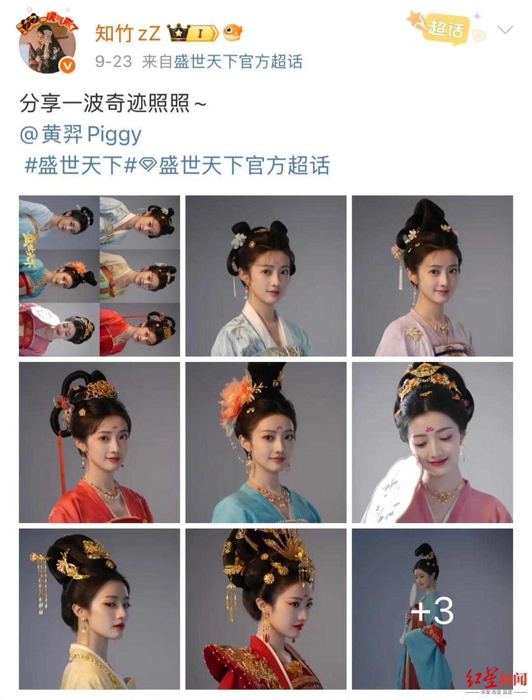 2024年1月,《盛世天下》在横店开机,剧组面临的第一个难题就是“预算有限”。为节省开支,团队没有雇服化道副导演,每天收工后,知竹和总制作人Demi要亲自定第二天的服装、道具。岂料,原定造型指导中途退出,他们紧急联系造型指导谭莉敏救场。对方用“低成本高审美”的设计,让韦贵妃的“牡丹高髻”、伍元照的“才人服”成为全网热议的“古风妆造模板”。