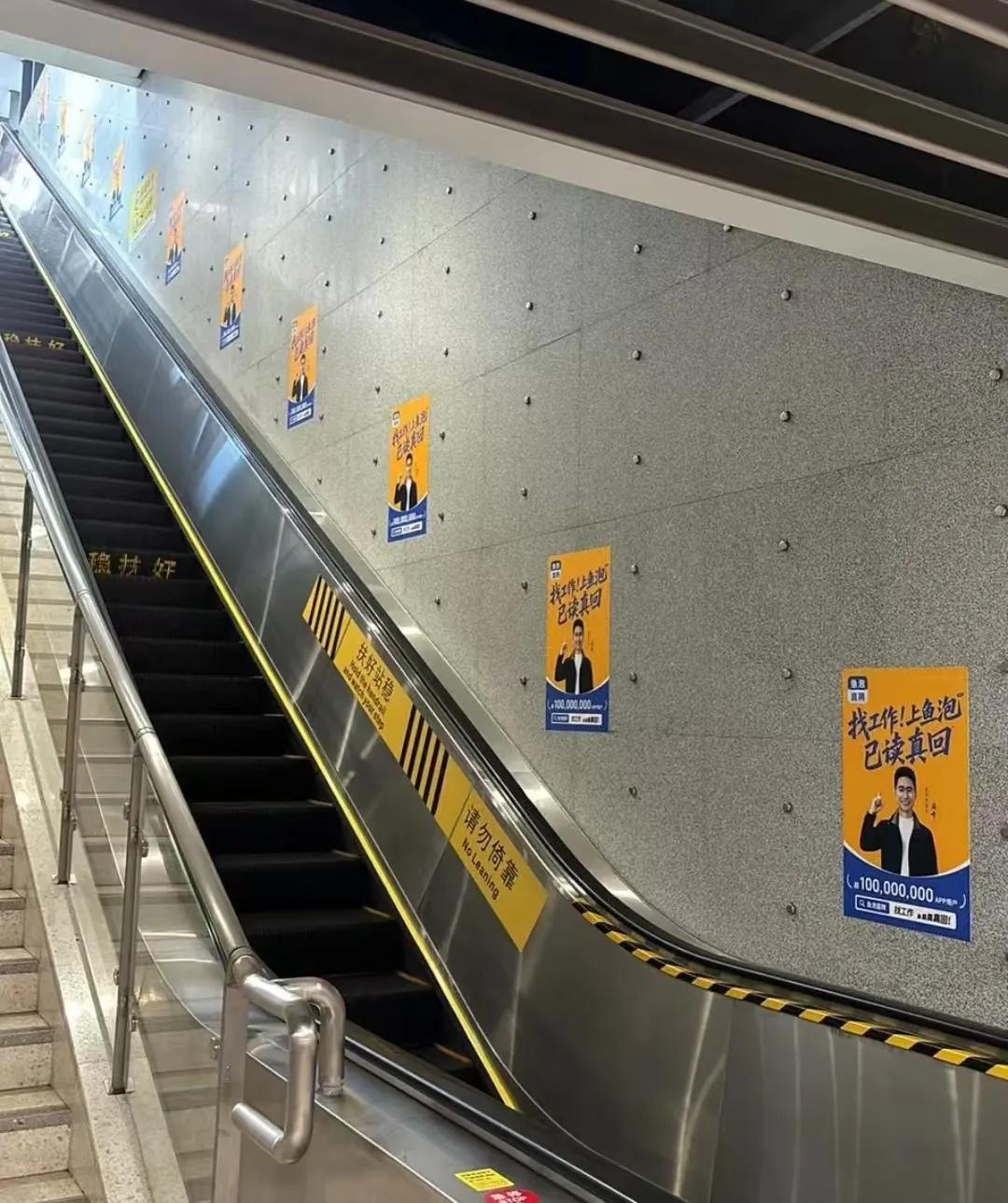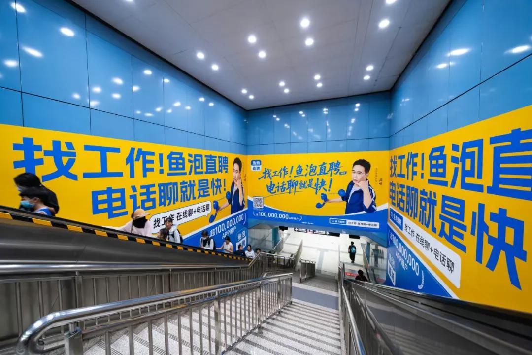 在一线城市的地铁,包括换乘处的走廊、站台灯箱长廊、扶梯、地铁车辆内部等,鱼泡直聘的广告无死角覆盖。