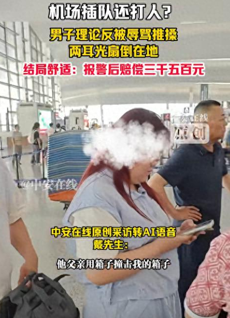 "麻烦请排队,大家都在等。"戴先生轻声提醒前方突然插入队伍的一家四口。这家人中,穿黑色外套的年轻男子不仅将行李箱横放在路中央,更对善意提醒报以粗口:"关你屁事?多管闲事!"话音未落,同行的体型偏胖女子突然冲上前,抬手就是两记重耳光,戴先生踉跄后退撞上后方行李箱,眼镜断裂在地。