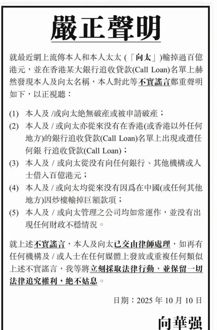 10日,向华强在香港登报发声明否认破产。声明中否认了网络上流传的“向华强及向太Tiffany陳嵐赌输百亿、被追收贷款”传闻, 称从来没有在任何地方因炒楼输掉巨额款项,不实谣言已交由律师处理。此外,港媒还透露向华强与向太将于今日下午召开记者会。此前,向佐也曾否认向家破产传闻。