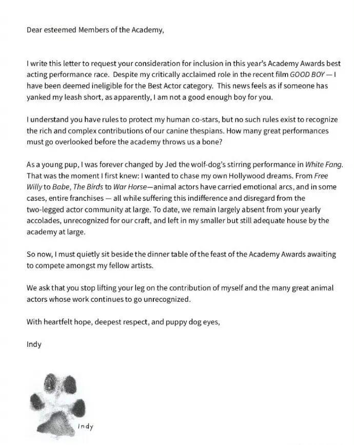 据外媒,恐怖片《好狗狗》主演小狗Indy向美国电影艺术与科学学院写信,提议奥斯卡设立动物演员表演类奖项:“还要有多少出色的表演被忽视,学院才会给我们一点认可呢?”