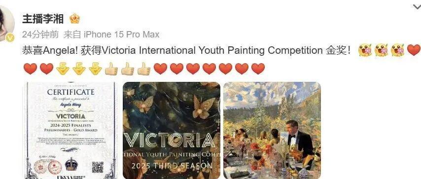 10月9日,李湘和王岳伦在微博平台分享了一则喜讯:他们的女儿王诗龄获得Victoria International Youth Painting Competition 金奖,并晒出相关证书。
