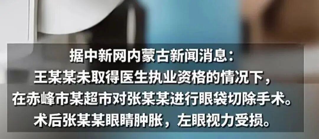 据中新网内蒙古新闻消息:王某某未取得医生执业资格的情况下,在赤峰市某超市对张某某进行眼袋切除手术。术后张某某眼睛肿胀,左眼视力受损。后张某某报案,经鉴定,其左眼视神经萎缩致左眼盲目,构成八级伤残;左眼失明,视觉功能部分丧失,属于轻度残疾。承办此案的检察官相海琪介绍说,王某某并没有接受过任何相关培训,“手艺”竟然全靠自学。她是因为之前在一些正规的美容院的工作的时候,看见过有大夫给人做过类似的手术,也从网络上查阅过相应的资料,看过相关视频,翻阅过类似的书籍,觉得这个事情很简单,一剌,拿出来,剪掉,一缝合,一消毒,就完事了,她觉得是没有问题,没有什么危险的。