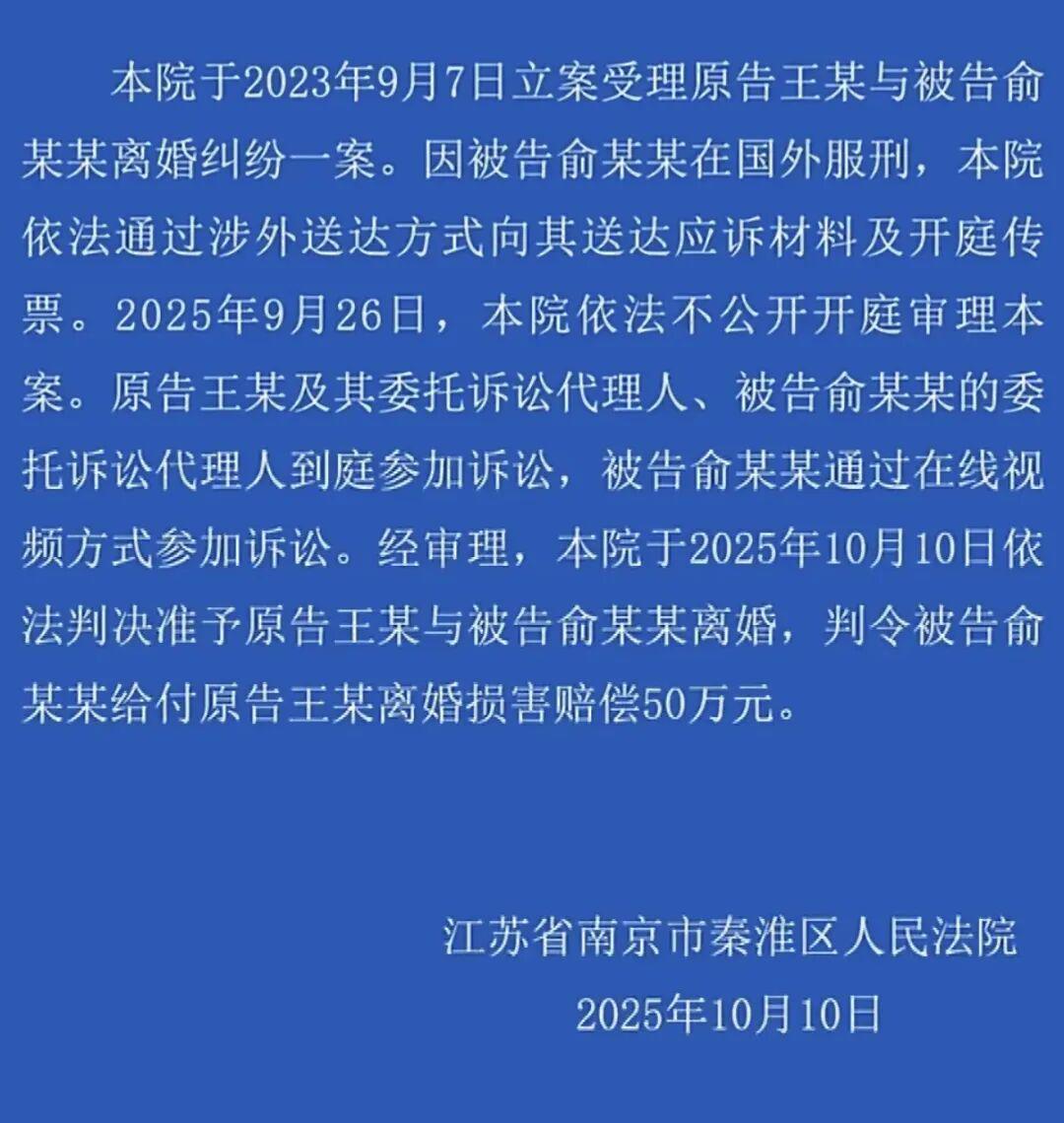 南京市秦淮区人民法院今日通报,本院于2023年9月7日立案受理原告王某与被告俞某某离婚纠纷一案。因被告俞某某在国外服刑,本院依法通过涉外送达方式向其送达应诉材料及开庭传票。2025年9月26日,本院依法不公开开庭审理本案。原告王某及其委托诉讼代理人、被告俞某某的委托诉讼代理人到庭参加诉讼,被告俞某某通过在线视频方式参加诉讼。经审理,本院于2025年10月10日依法判决准予原告王某与被告俞某某离婚,判令被告俞某某给付原告王某离婚损害赔偿50万元。