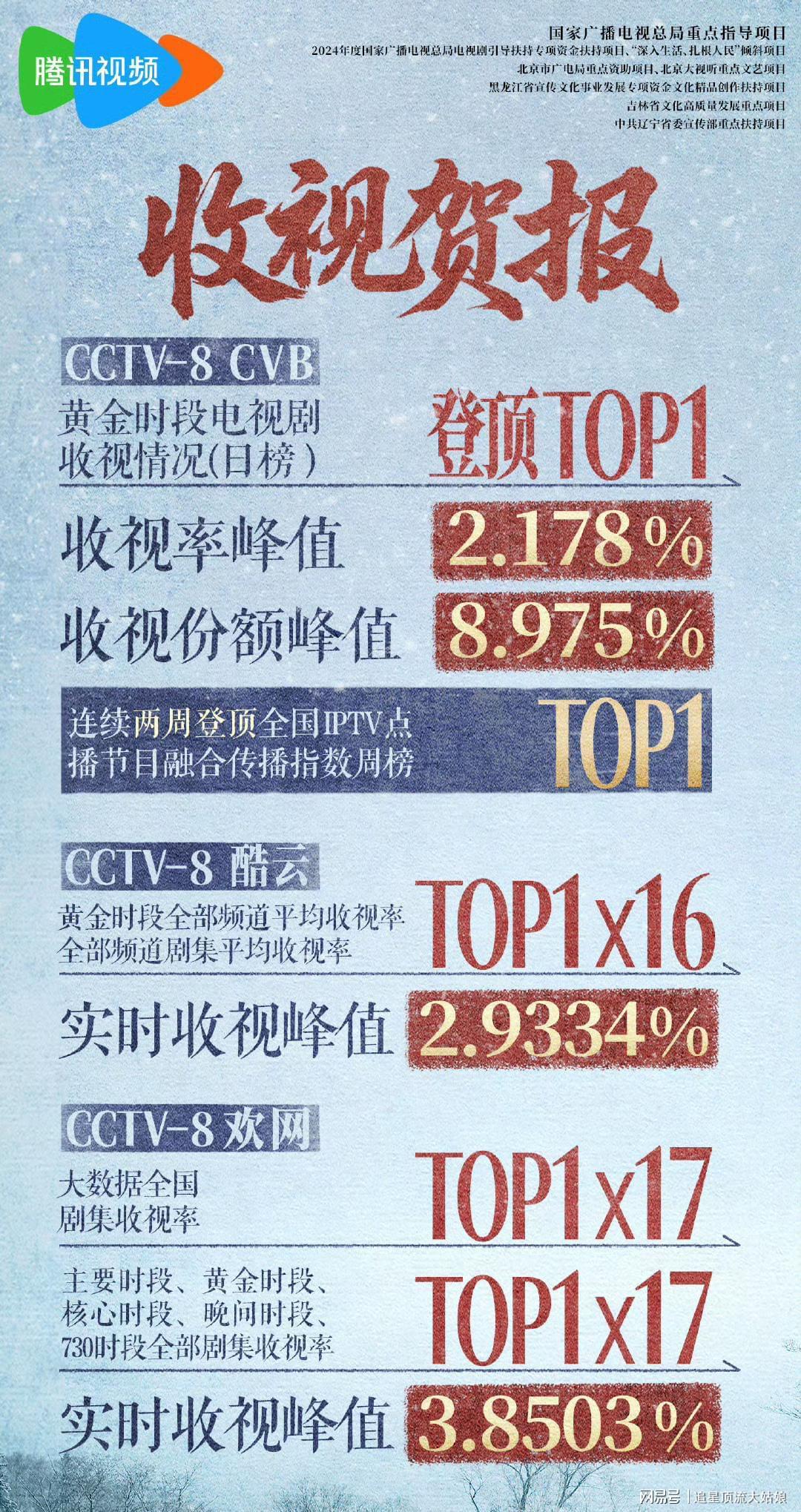自2025年9月20日在腾讯视频开播首日热度值迅速突破24000,云合市占率达8.4%,登顶腾讯视频“拉新周榜”第一。抖音话题播放量破35亿。