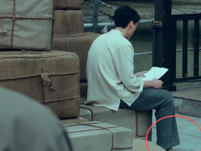 在码头的一个片段中,一位男演员认真地看着手上的报纸,然而他的服饰却有些出戏。因为他脚上穿的是一双帆布鞋,这在那个时代显然是不合时宜的。按道理说,那个时代工人大多穿的都是布鞋,这种现代化的帆布鞋款式实在太让人出戏了。