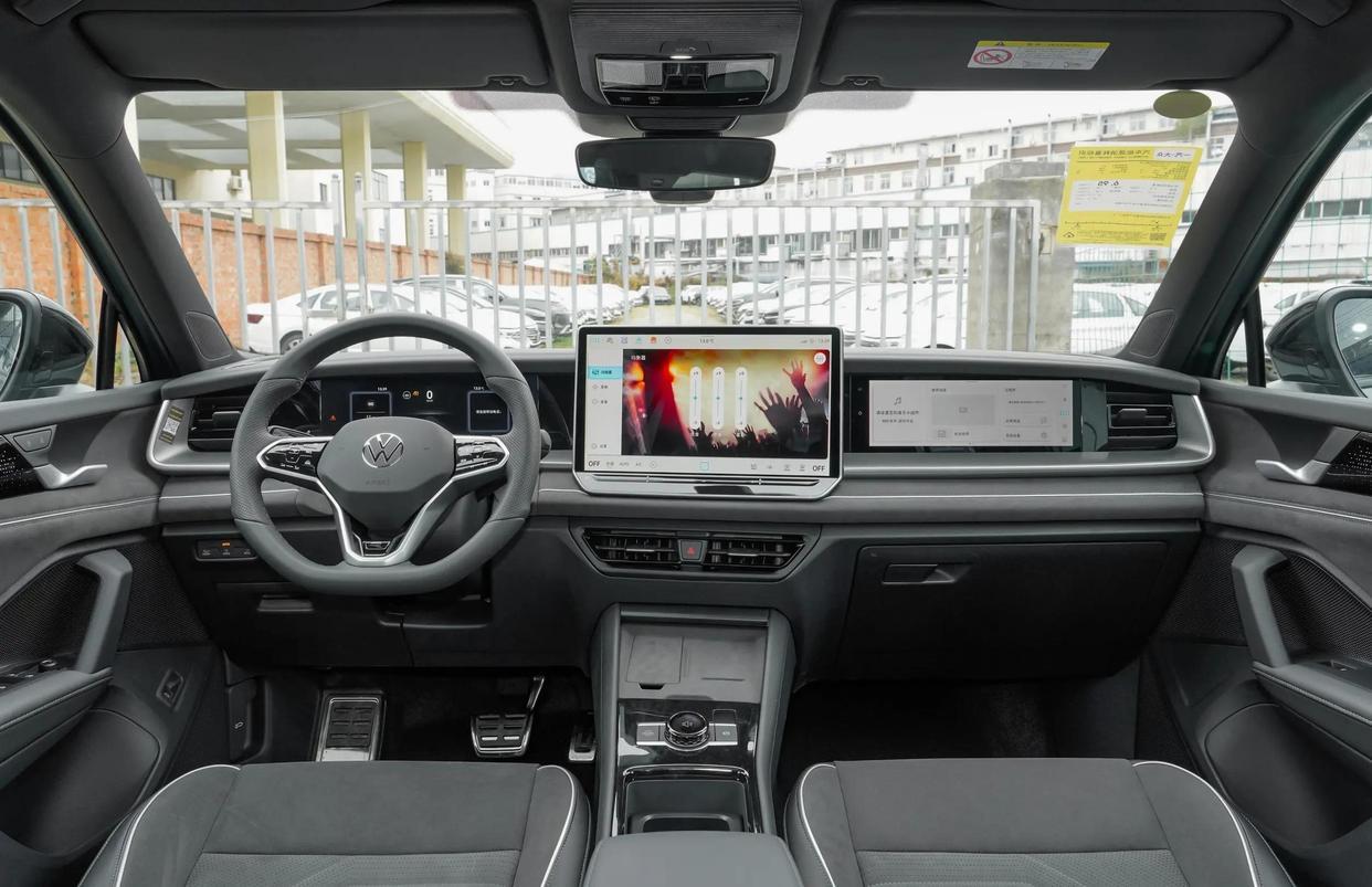 内饰方面,探岳以黑色为主色调,搭配R-Line运动风格元素,营造出强烈的运动氛围。中控台搭载了10.25英寸液晶仪表、15英寸中控屏以及11.6英寸副驾娱乐屏,车机采用高通8155芯片,支持语音控制,虽然科技感不是最强,但日常使用完全足够。