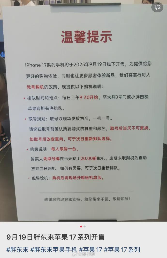近日,一则关于胖东来iPhone 17系列手机发售的购机说明在社交媒体上引发了广泛关注。据网友发布的消息,胖东来将于9月19日正式线下开售iPhone 17系列手机,并实行严格的购机规则。