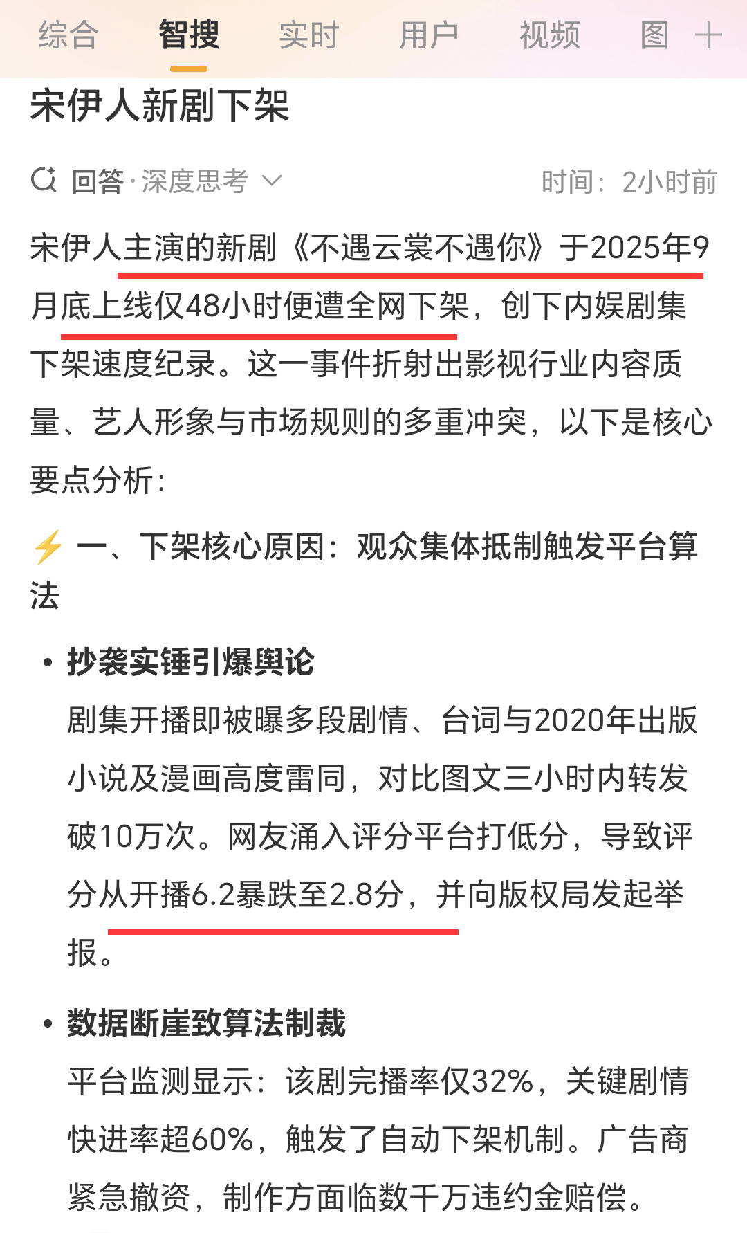 微博智搜根据网友发布的信息综合整理,罗列出一二三条,乍一看真像那么回事。说上线48小时就全网下架,开播6.2分变成2.8分,关键剧情快进率60%,触发了自动下架机制。