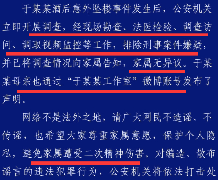 明确称于朦胧是酒后意外坠楼身亡,个别人员为博眼球、蹭流量在网上编造传播虚假信息。
