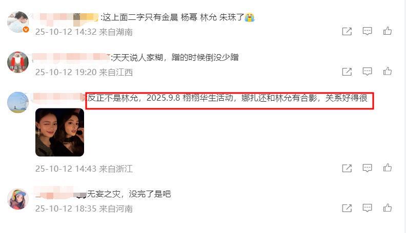 同时,有粉丝指出娜扎和林允关系良好,今年9月还曾一起合影,不可能存在矛盾。