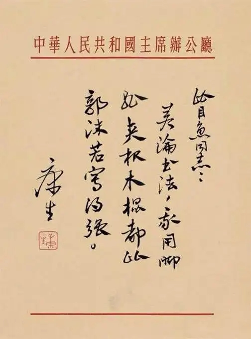 尽管争议缠身,但书法界对康生的功底向来认可。与他往来密切的王力先生,晚年在《王力与文物》中坦言,康生的书法“下笔便见传统功力,非一般文人所能企及”。这种评价并非客套:王力本人亦是金石书画行家,眼光极为挑剔,能获其盛赞,足见康生实力。