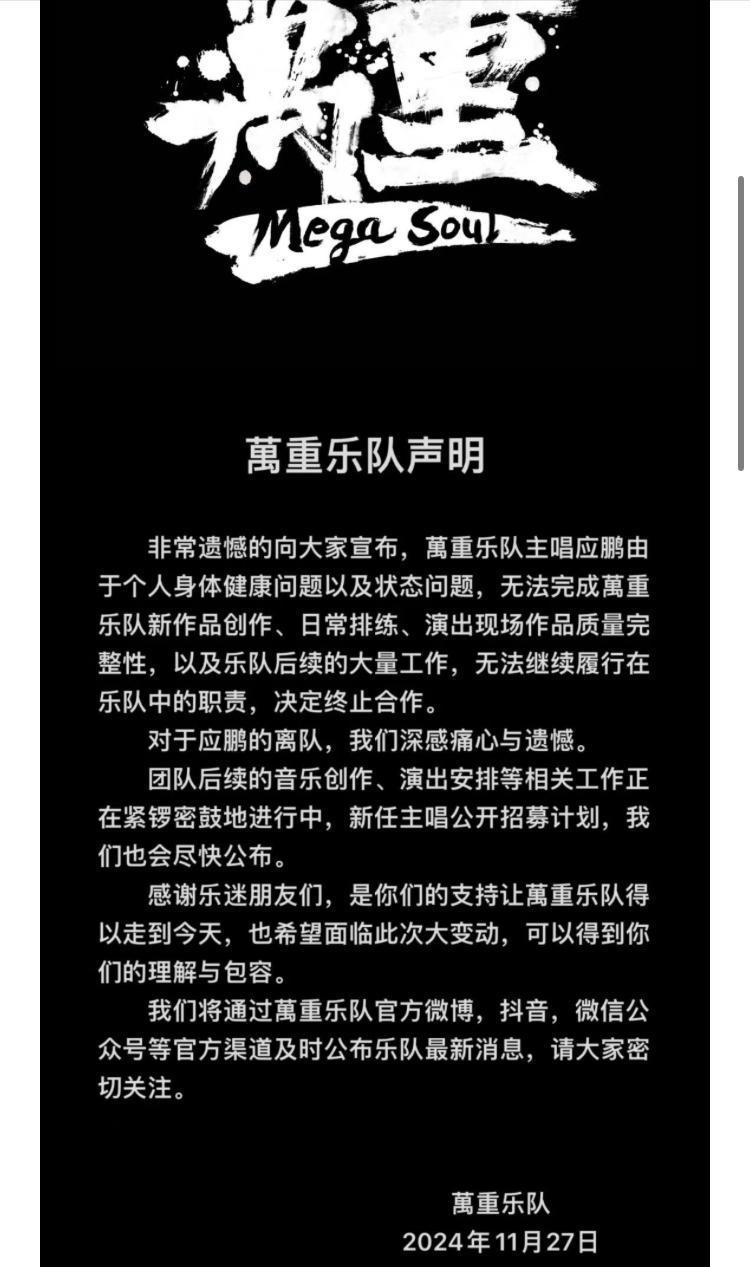 2024年11月,他离开了万重乐队,当时万重乐队发布的声明中写道应鹏因为疾病,身体已经完全无法行动。