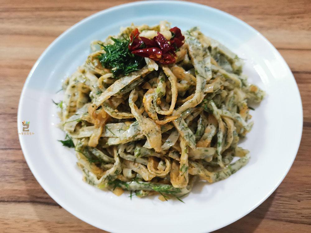 4、将其夹出来,卷到一起,切成细长条的形状。接着装到大碗里,放些茴香苗,蒜蓉,干辣椒,生抽,醋,另外少点热油淋进去,快速拌一拌,令其入味即可。是菜也是饭,特美味。