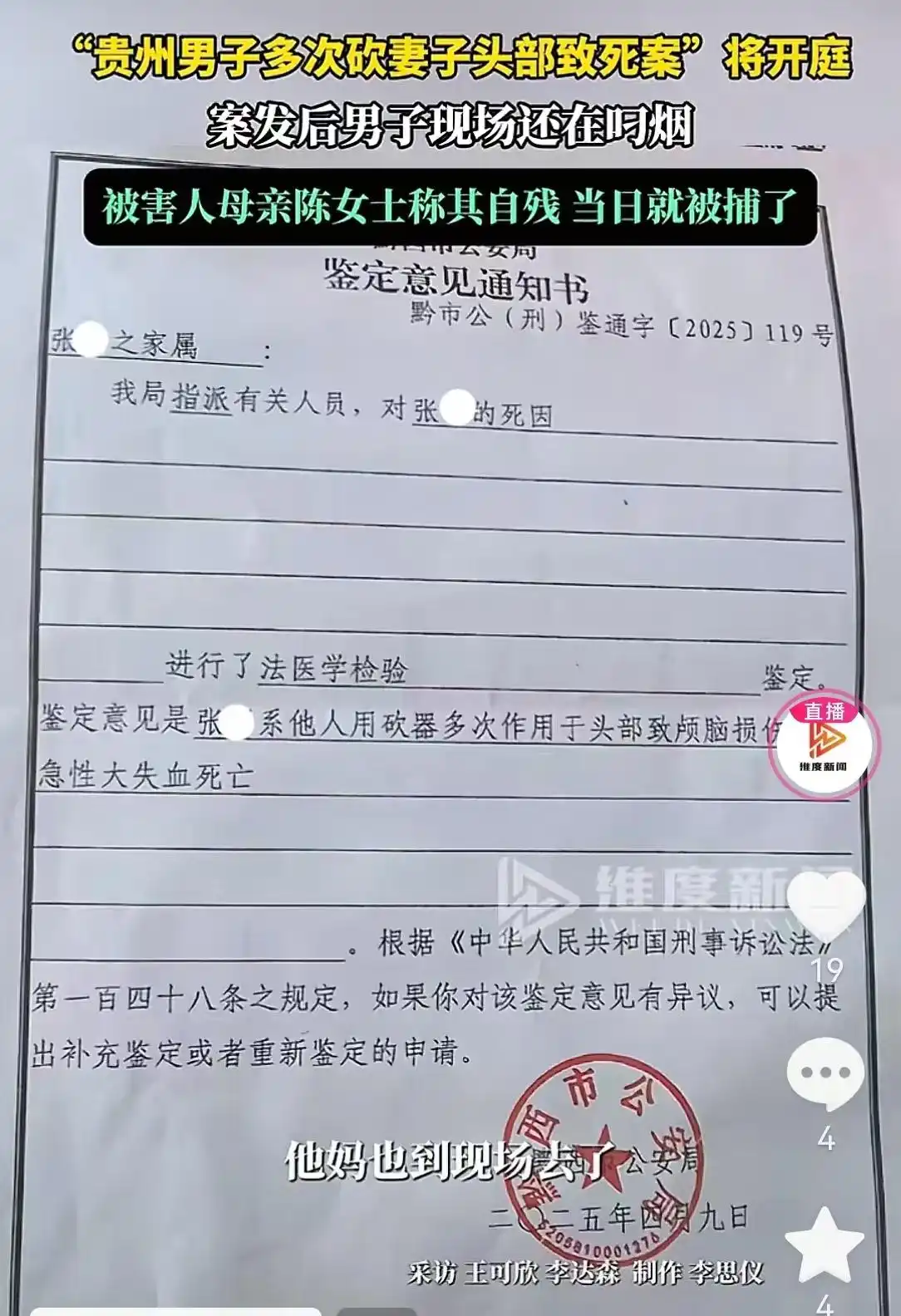 10月11日,维度新闻记者李达森采访了贵州被丈夫砍头致死的张某的母亲。据她透露,女儿张某被女婿陈某某杀害的案件将于本月16日正式开庭审理。