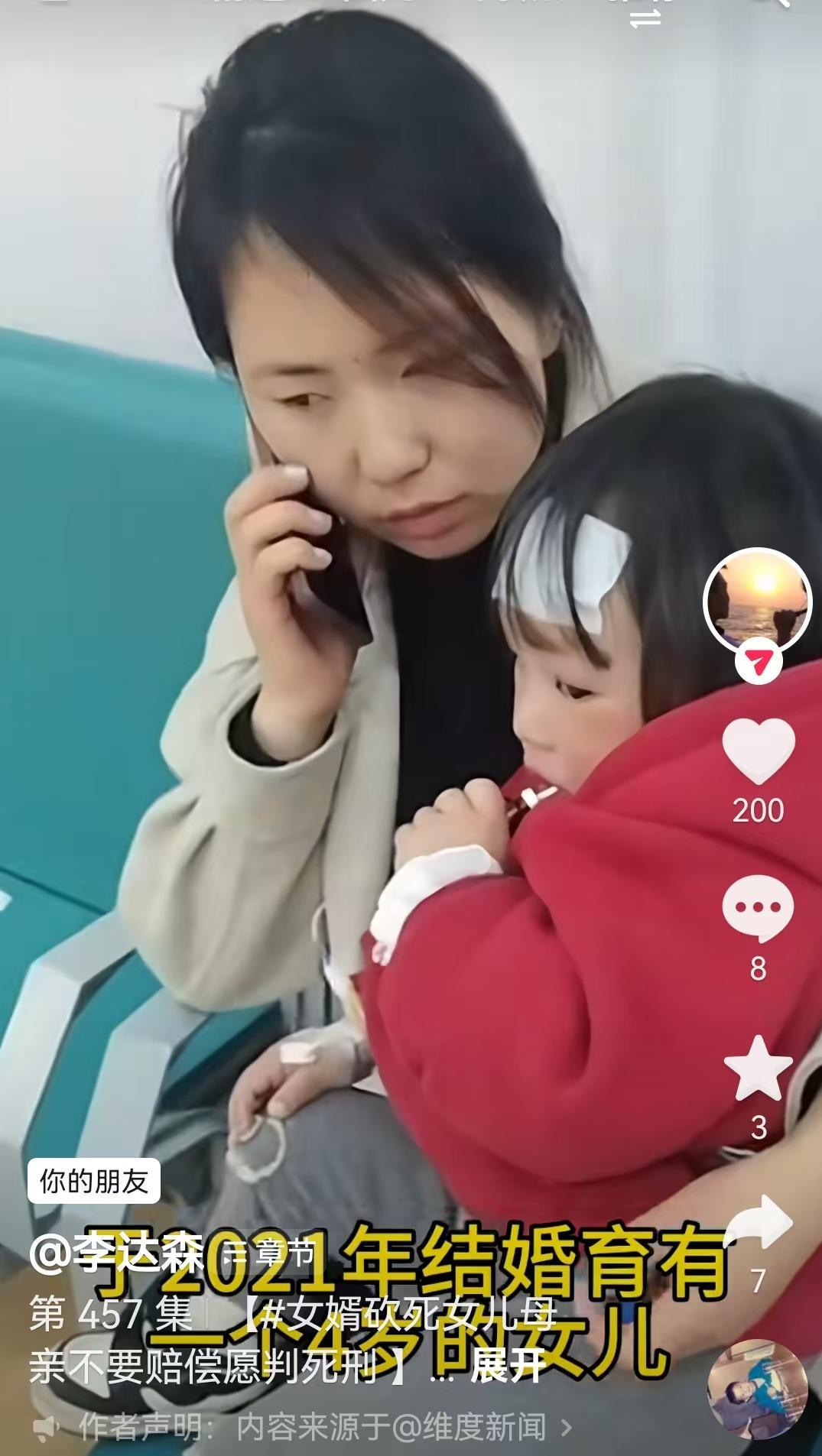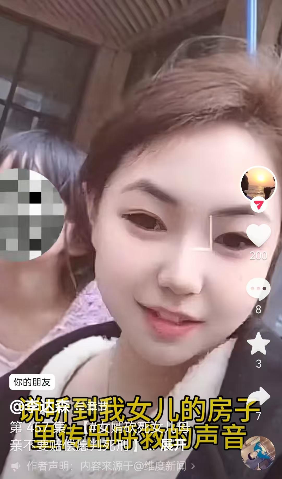 据邻居描述,案发当天进入房间后,发现张某倒在血泊中,头部遭受多处砍击,现场惨烈。屋内还有受伤的女婿刘某某,他在杀害妻子后选择自残,后被送医救治,目前无生命危险。