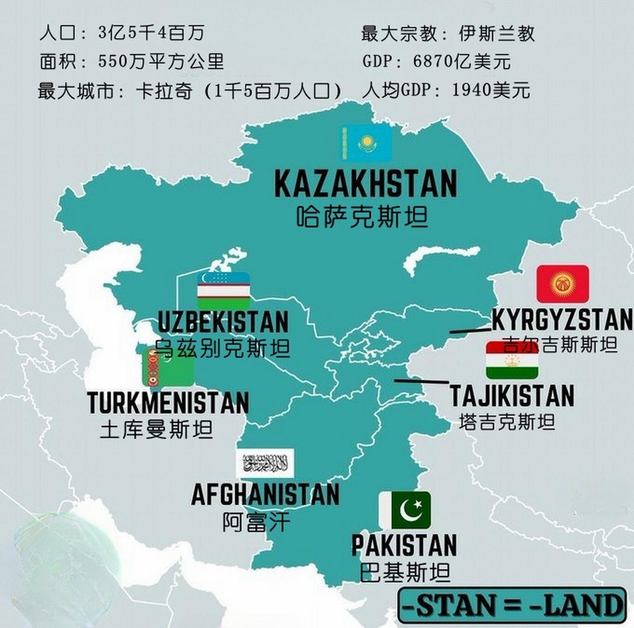 在地图上,哈萨克斯坦、吉尔吉斯斯坦、塔吉克斯坦、乌兹别克斯坦、土库曼斯坦,以及南亚的巴基斯坦和阿富汗,这七个名字中均带有‘斯坦’的国家看似地理位置相近,语言中还都带有波斯或突厥文化的影子,为何却始终未能合并成一个统一的国家呢?