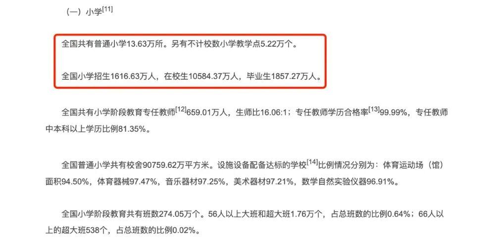 今年6月,教育部统计数据显示,2024年全国普通小学共有13.63万所,全国小学招生1616.63万人,在校生10584.37万人。