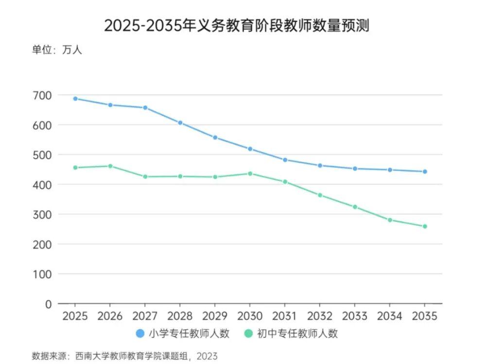 西南大学的研究认为,2023-2024年是小学教师需求的巅峰期,人数约为686万,此后就会持续下跌,初中老师人数会在2026年达到峰值,约460万人,之后也要下降。