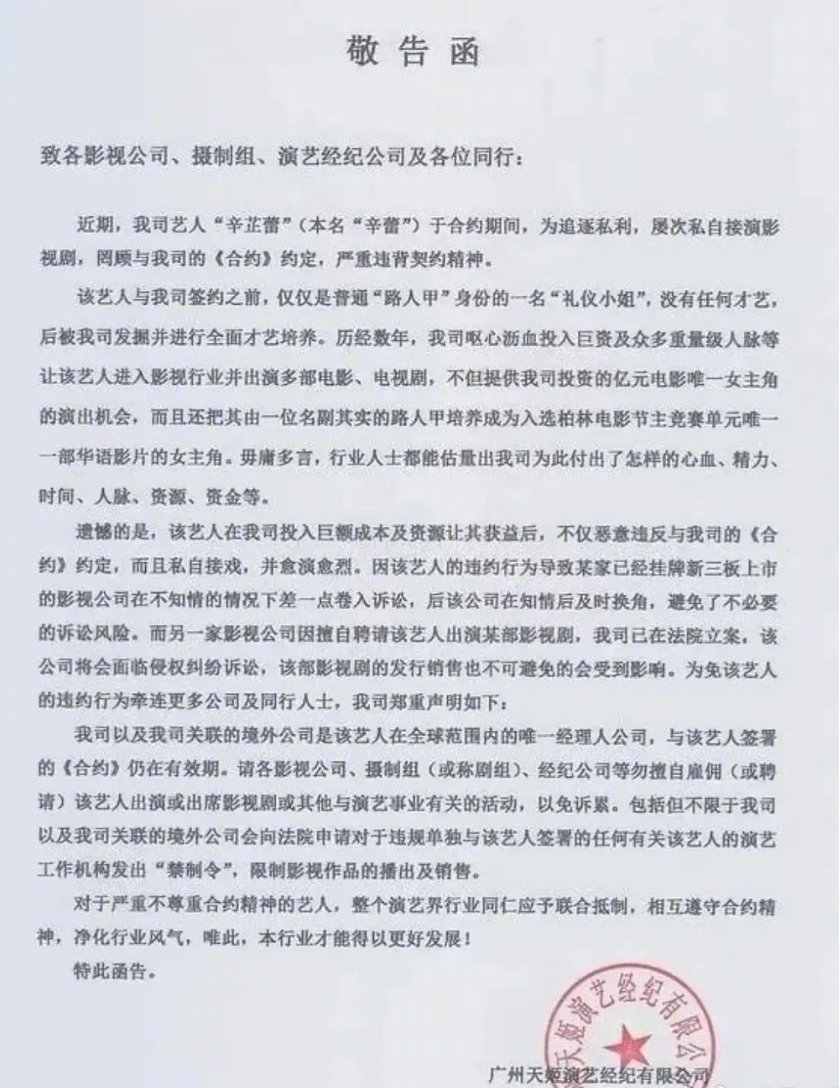 2016年梁婷的公司发过一篇“敬告函”,说辛芷蕾之前只是“普通路人甲”、“礼仪小姐”,公司把她培养出来之后“追名逐利”、“严重违背契约精神”,用词算得上刻薄,没有一点温情可言。