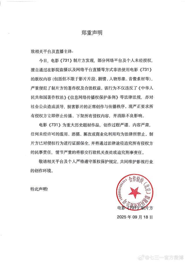 该声明指出,近期发现部分网站、平台及个人未经授权,擅自传播电影《731》的相关内容,包括但不限于影片片段、海报、剧照等,严重侵犯了电影的版权及合法权益。