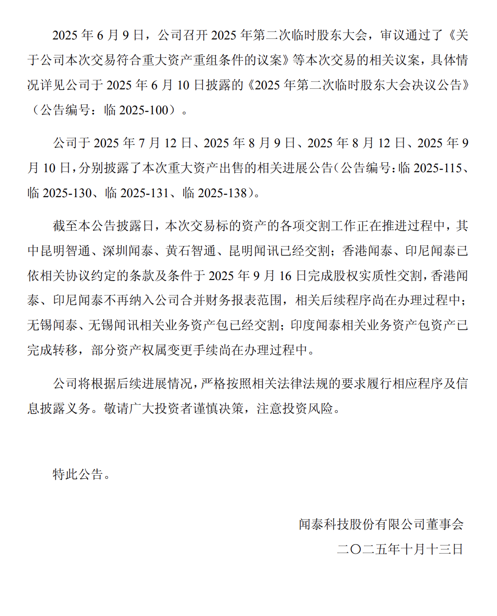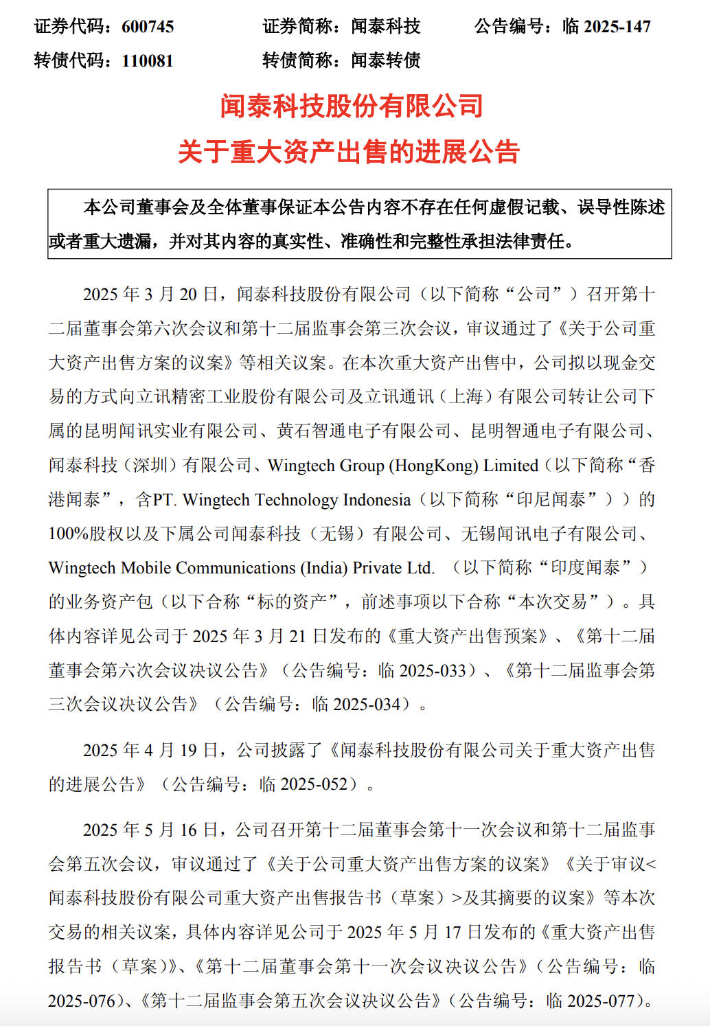 2025年10月13日,闻泰科技(证券代码:600745,转债代码:110081,转债简称:闻泰转债)正式发布《关于重大资产出售的进展公告》(公告编号:临2025-147),详细披露了公司资产出售的最新进展。