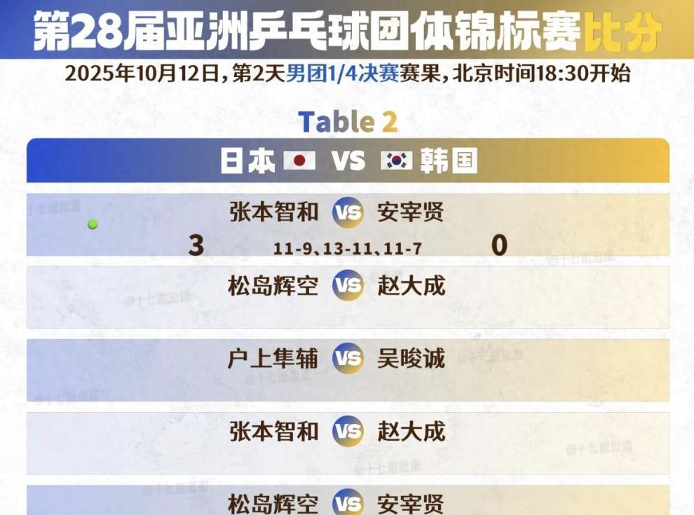 赛场内的激烈角逐同样扣人心弦。在男团1/4决赛的焦点战中,日本头号选手张本智和以3-0(11-9、13-11、11-7)的比分横扫韩国名将安宰贤,不仅为日本队拿下了关键的一分,还成功报了今年8月WTT瑞典大满贯上2-3不敌对手的一箭之仇。