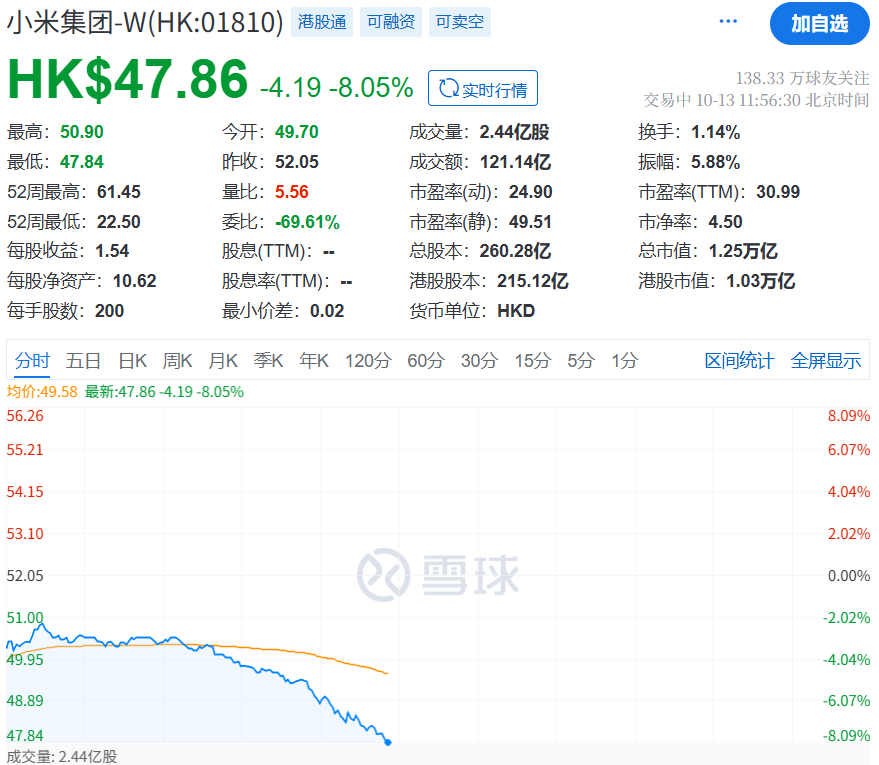 此次事故再次将小米汽车推上舆论风口。值得关注的是,今年3月底安徽铜陵曾发生类似事件:一辆小米SU7标准版在高速路段撞击护栏后起火,导致车内3名乘员不幸遇难。双重事件叠加影响下,今日港股开盘阶段科技股普遍承压,小米集团(01810.HK)股价低开8%,现报47.86港元/股。