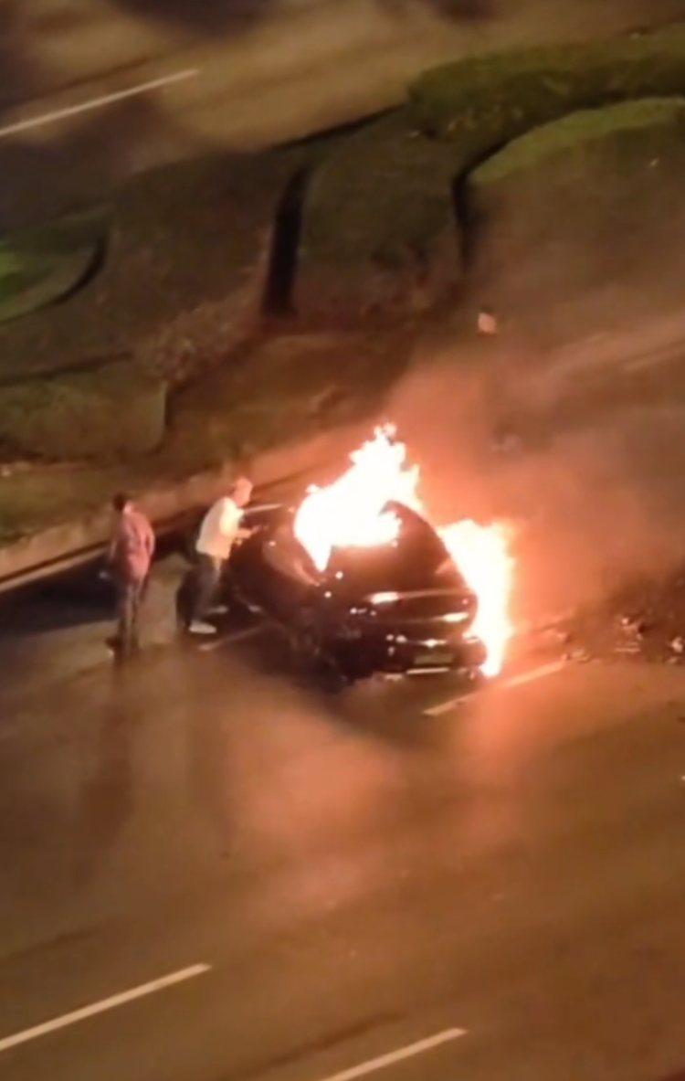 多段现场视频显示,汽车尾部起火后,有4名男子迅速靠近车辆,试图通过拉开车门或肘击车窗玻璃的方式进行救援。其中,一名白衣男子尤为显眼,他用力肘击驾驶位玻璃,试图救出被困的司机。