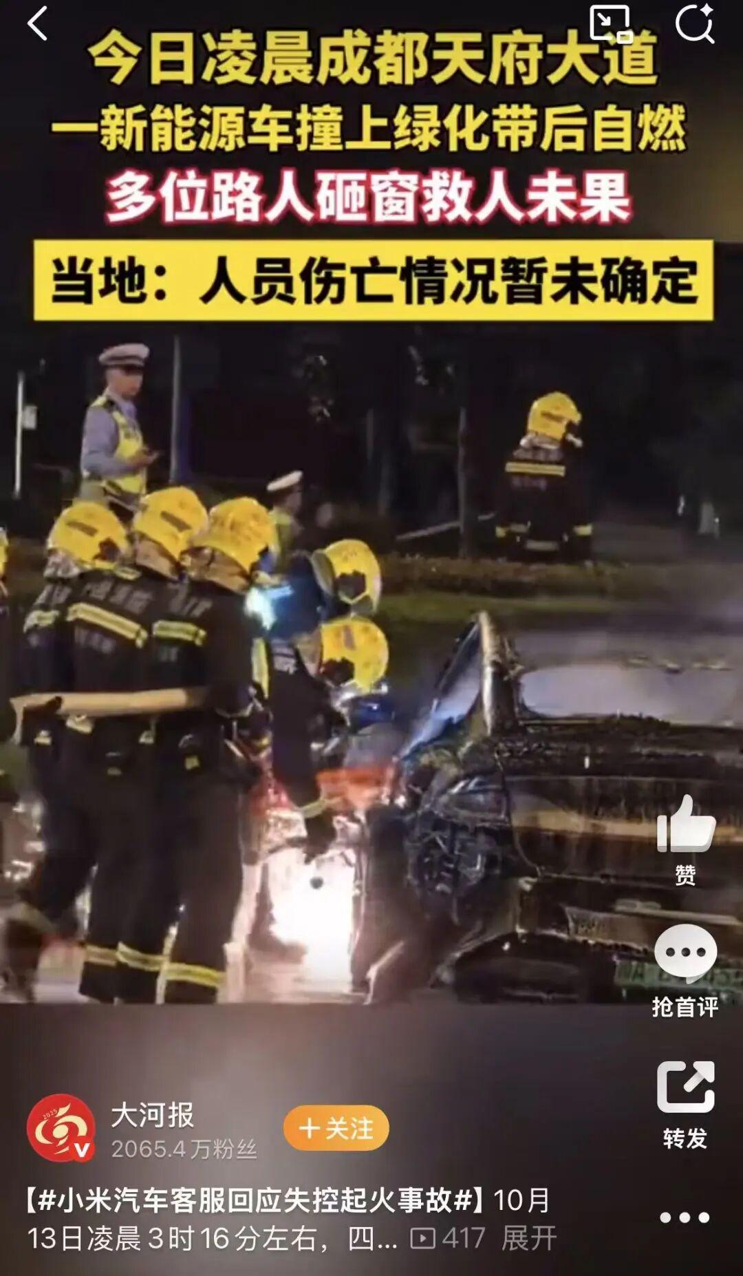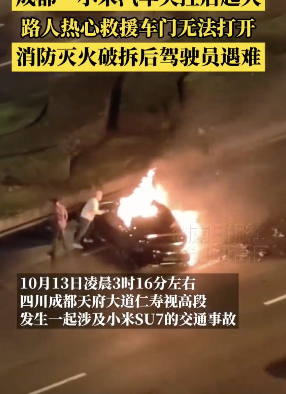 10月13号凌晨,成都天府大道上出大事了。一辆小米 SU7 Ultra,撞了之后瞬间烧成火球。
